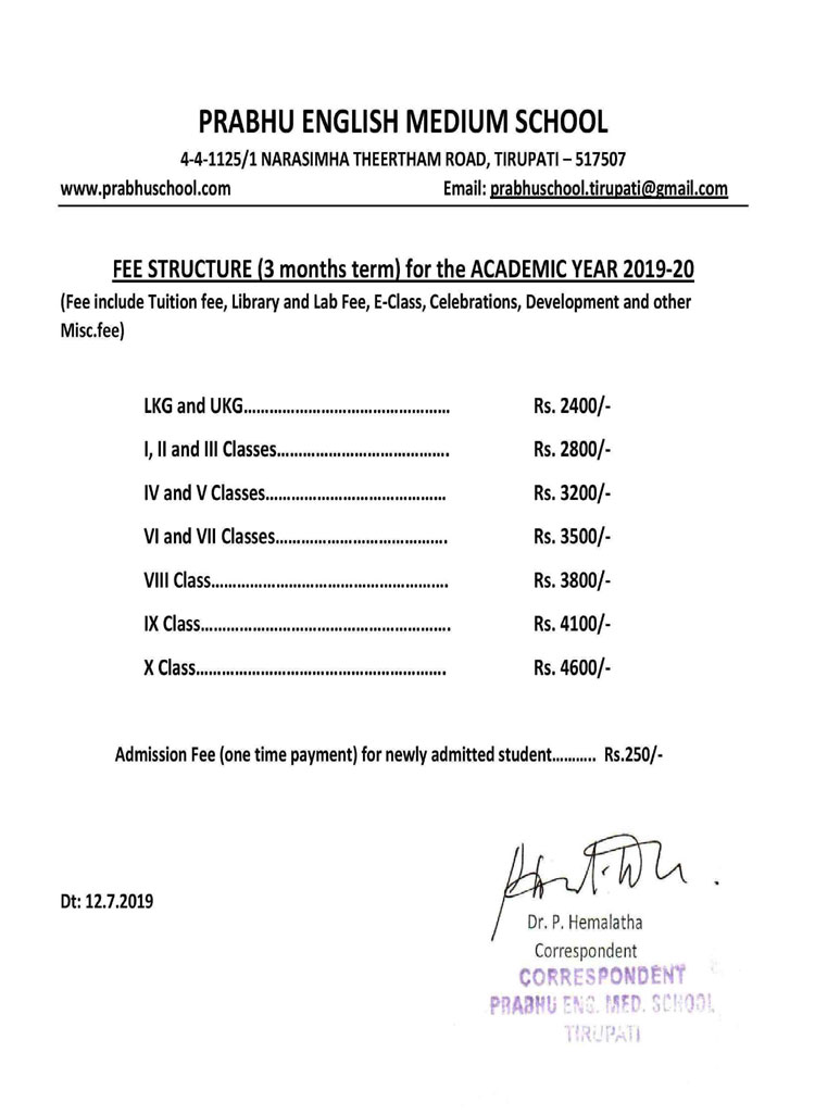 FEE STRUCTURE for the ACADEMIC YEAR 2019-20
